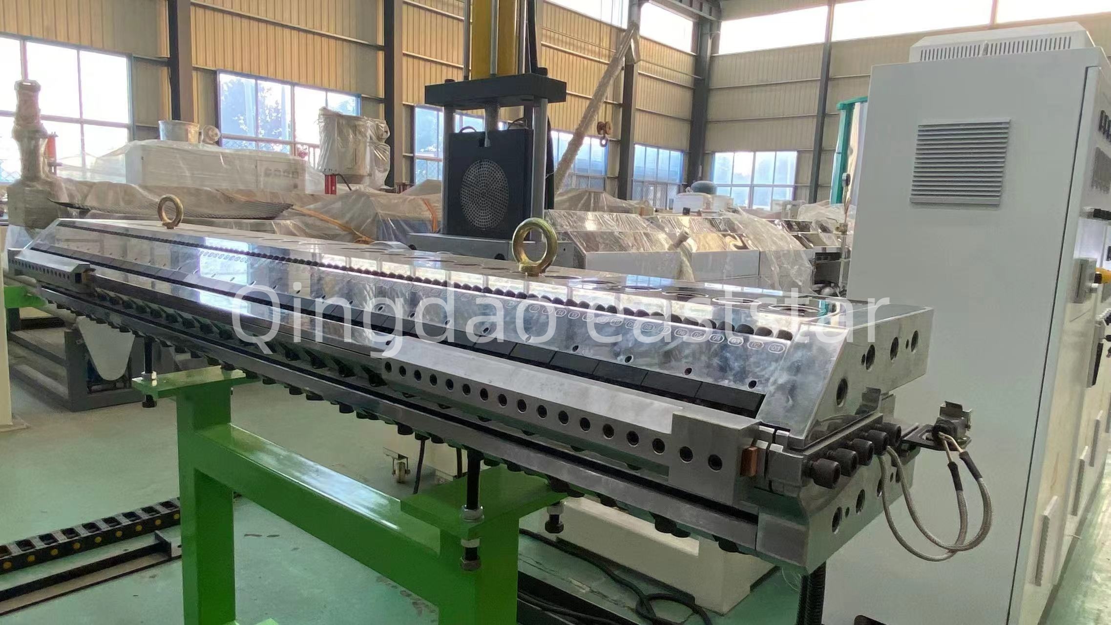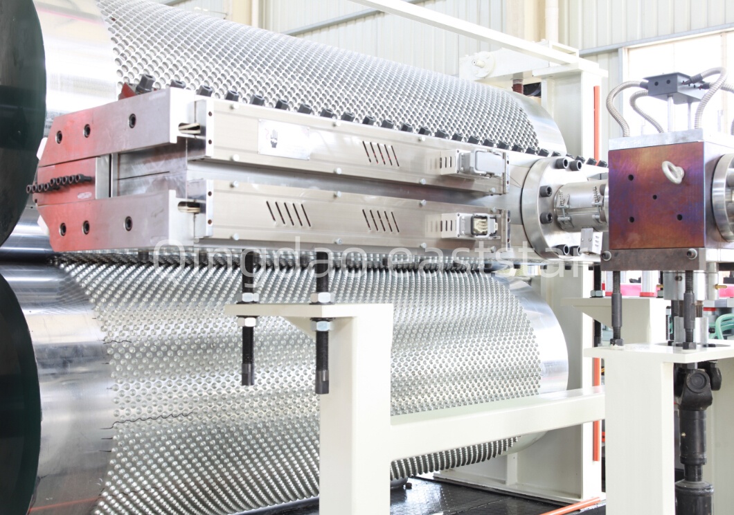 PE排水板生產線的模具系統采用衣架式流道設計,模具寬度1650mm,可生產0.8-1.2mm厚度的單層排水板。模具流道表面鍍鉻處理,拋光至鏡面效果,型腔粗糙度Ra0.1um,模唇粗糙度Ra0.05um。兩輥成型裝置配備Φ450×1700mm輥筒,輥面硬度HRC58-62,鍍鉻厚度0.08mm,通過特殊多流道設計確保溫度均勻。這些專業配置保障了